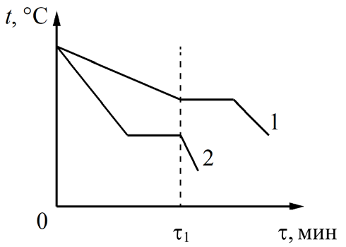 Задание 14. На рисунке приведены графики зависимости температуры t от времени τ двух тел одинаковой массы, изготовленных из разных веществ и выделяющих одинаковое количество теплоты в единицу времени. Первоначально вещества находились в жидком состоянии.