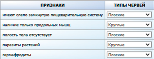 Задание 12. Установите соответствие между признаками и типами червей, для которых они характерны: к каждой позиции, данной в первом столбце, подберите соответствующую позицию из выпадающего списка.