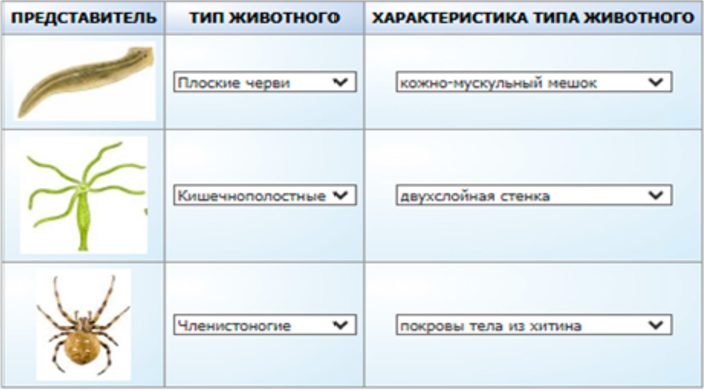 Задание 14. Рассмотрите изображения организмов, относящихся к разным типам животных. По рисункам определите, к какому типу принадлежит каждый из изображённых организмов, и характерный признак для данного типа животных. Название типа и его характеристику выберите из выпадающих списков.