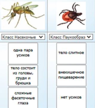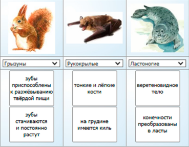 Перетащите изображения животных к их характеристикам и выберите из выпадающего списка класс данного животного. Среди представленных изображений есть лишние.