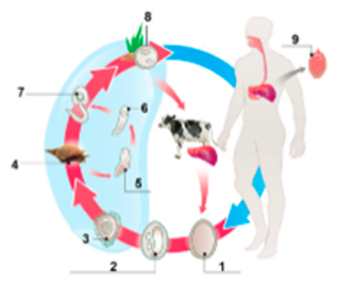Какой цифрой на схеме обозначен промежуточный хозяин печёночного сосальщика?