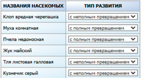 Задание 16. Установите соответствие между названиями насекомых и их типом развития: к каждому элементу из первого столбца подберите соответствующий элемент из выпадающего списка.