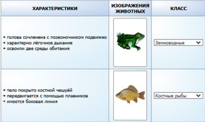 Выберите из выпадающих списков классы представленных животных и перетащите перечисленные ниже признаки организмов к их изображениям. Среди признаков есть лишние.