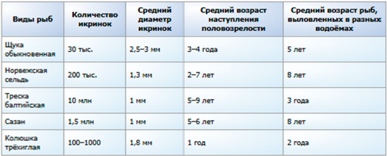 Диапазон средних размеров икринок представленных в таблице рыб составляет 1 мм — 3 мм.