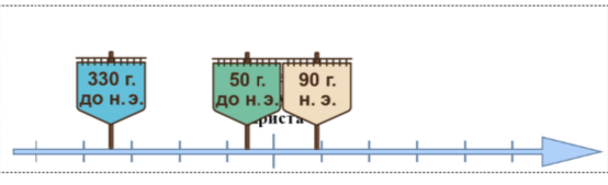 Задание 1. На данной ленте времени каждый отрезок между делениями соответствует одному веку. Отметьте на ленте времени чёрточками и подпишите следующие годы: 330 г. до н.э., 50 г. до н.э., 90 г. н.э.