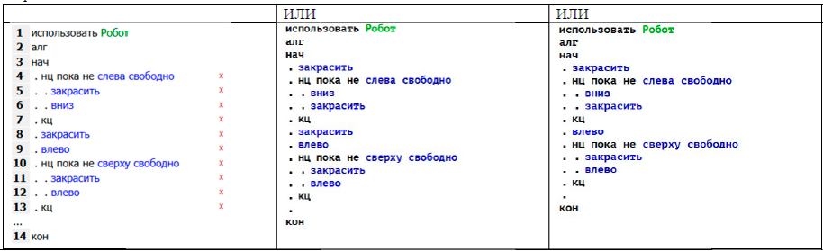 Конечное расположение Робота может быть произвольным. Алгоритм должен решать задачу для произвольного размера поля и любого допустимого расположения стен внутри прямоугольного поля. Алгоритм должен содержать не более двух циклов и вне циклов не более двух подряд идущих команд: вверх, вниз, влево, вправо, закрасить. При исполнении алгоритма Робот не должен разрушиться. Выполнение алгоритма должно завершиться. Роботу запрещается посещать одну и ту же клетку дважды.