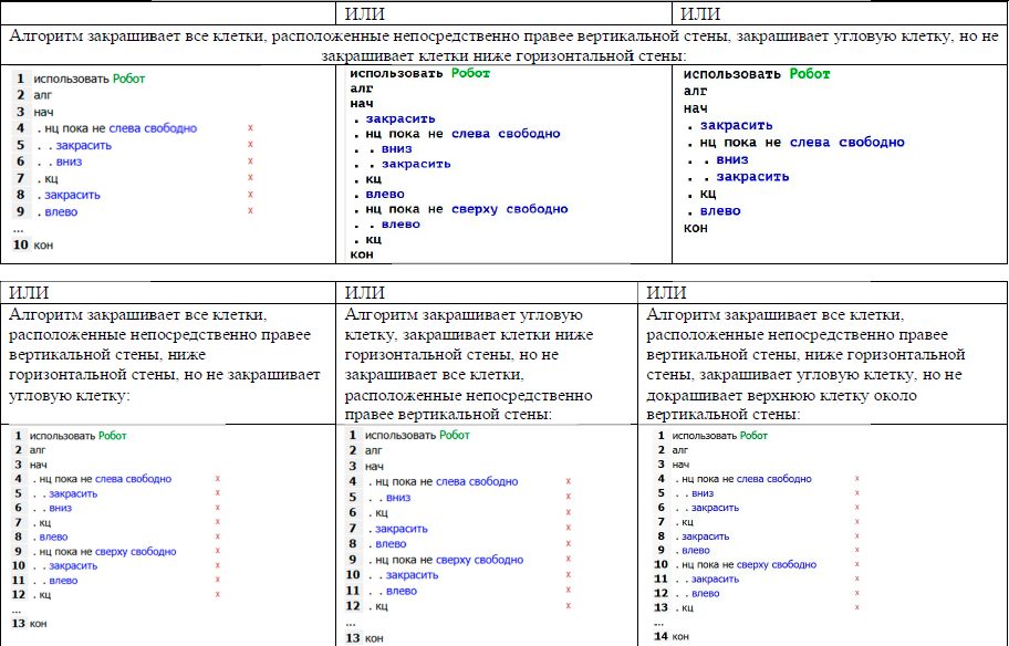 Алгоритм закрашивает все клетки, расположенные непосредственно правее вертикальной стены, ниже горизонтальной стены и угловую клетку. Алгоритм должен содержать 2 цикла и не более двух подряд идущих команд: вниз, влево, вправо, закрасить вне цикла: