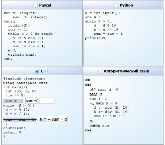 Задание 11. Программисту дали задание написать программу, при выполнении которой с клавиатуры считывается натуральное число N, не превосходящее 109, и выводится сумма цифр этого числа. Программист торопился и написал программу неправильно. Ниже приведён текст данной программы, написанный на четырёх языках программирования: