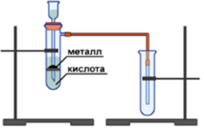 Задание 7Б. На рисунке изображён прибор, который предложил ученик, чтобы получить водород взаимодействием некоторого металла с кислотой и собрать его, используя метод вытеснения воздуха.