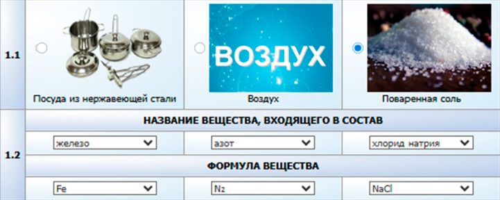 1.2 Установите соответствие между веществами, которые входят в состав объектов, изображённых на рисунках, и их названиями, и формулами.