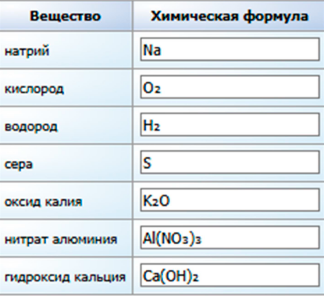 Задание 6.1. Заполните таблицу. Для записи формул веществ используйте виртуальную клавиатуру, которая появится внизу экрана компьютера после внесения курсора в ячейку.