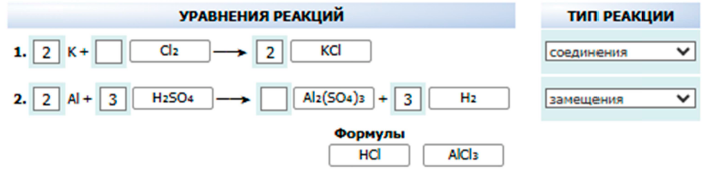 Составьте уравнения описанных химических реакций. Для этого в предложенные схемы реакций перетащите с помощью компьютерной мыши формулы пропущенных веществ, выбрав их из приведённого перечня, и расставьте необходимые коэффициенты. Для записи коэффициентов воспользуйтесь клавиатурой компьютера.