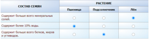 Используя содержание таблицы «Состав семян растений», выберите одно растение для каждой характеристики.