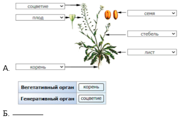 Б. Переместите с помощью компьютерной мыши в таблицу по одному любому примеру вегетативного и генеративного органов растения пастушья сумка.