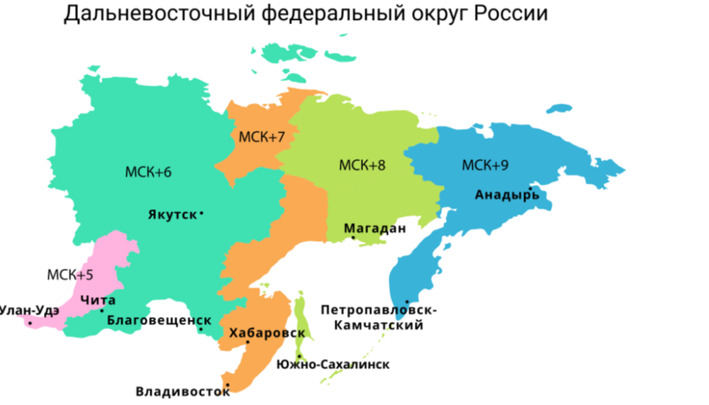 Задание 4. В самом большом федеральном округе России – Дальневосточном – целых 5 часовых поясов. Дима летит ночным рейсом на самолёте из Петропавловска-Камчатского в Москву. В какой-то момент пилот объявил, что до посадки осталось ровно 3 часа. Тогда Дима посмотрел на свои часы, которые ещё не успел перевести на московское время. Во сколько по московскому времени пилот планирует совершить посадку? Воспользуйтесь картой часовых поясов Дальневосточного федерального округа России.