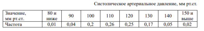 Задание 9. Во время диспансеризации в университете студентам измеряли артериальное давление. При измерении определяют два значения: кровяное давление в момент максимального сокращения сердечной мышцы (систолическое) и в момент расслабления мышцы (диастолическое). Поскольку артериальное давление очень изменчивая величина, обычно измерения округляются до десятков миллиметров ртутного столба. В таблице показаны измеренные значения систолического давления и частоты этих значений.