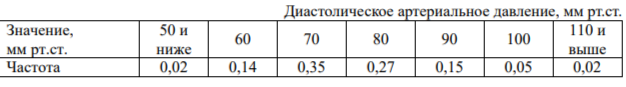 Задание 9. Во время диспансеризации в университете студентам измеряли артериальное давление. При измерении определяют два значения: кровяное давление в момент максимального сокращения сердечной мышцы (систолическое) и в момент расслабления мышцы (диастолическое). Поскольку артериальное давление очень изменчивая величина, обычно измерения округляются до десятков миллиметров ртутного столба. В таблице показаны измеренные значения диастолического давления и частоты этих значений.