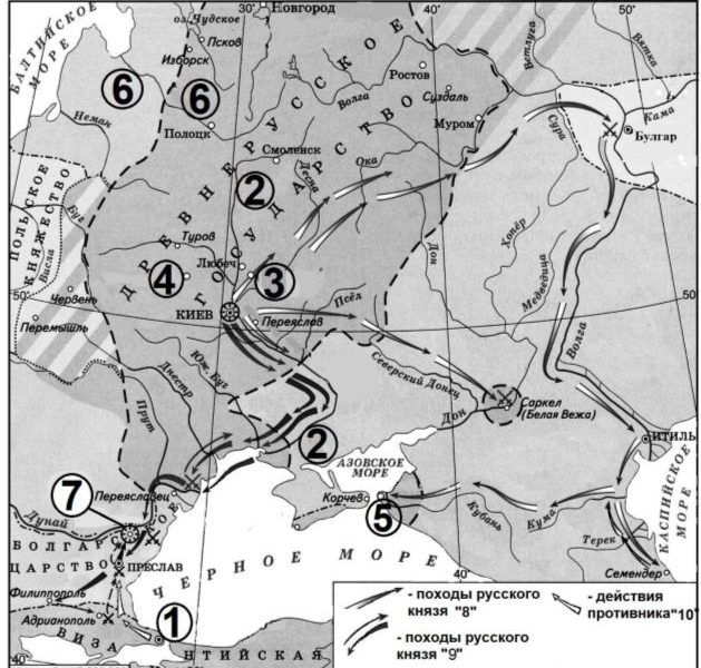 3) В обозначенном на схеме цифрой «5» городе сын князя, совершившего походы, обозначенные в легенде схемы цифрами «8» и «9», принял крещение.