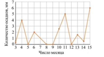 Задание 3. На рисунке жирными точками показано суточное количество осадков, выпадавших в Казани с 3 по 15 февраля 1909 года. По горизонтали указываются числа месяца, по вертикали — количество осадков, выпавших в соответствующий день, в миллиметрах. Для наглядности жирные точки на рисунке соединены линией. Определите по рисунку, какого числа впервые выпало 5 миллиметров осадков
