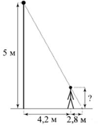 Задание 10. Человек стоит на расстоянии 4,2 м от столба, на котором висит фонарь, расположенный на высоте 5 м. Тень человека равна 2,8 м. Какого роста человек (в метрах)?