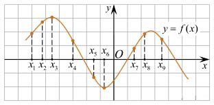 Задание 8. На рисунке изображён график дифференцируемой функции y = f(x). На оси абсцисс отмечены девять точек: x1, x2, x3, …, x9. Среди этих точек найдите все точки, в которых производная функции f(x) отрицательна. В ответе укажите количество найденных точек.