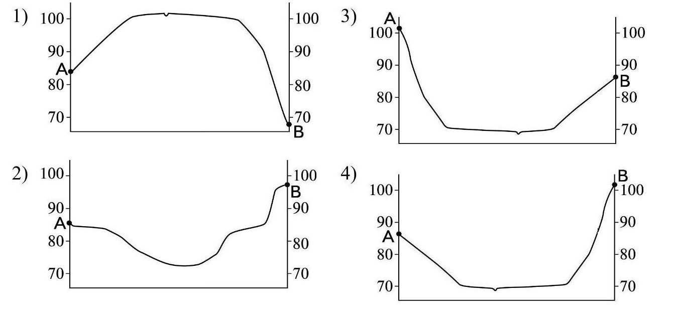 Задание 11. На рисунках представлены варианты профиля рельефа местности, построенные на основе карты по линии А – В разными учащимися. Какой из профилей построен верно?