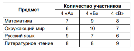 В школе подвели итоги участия 4-х классов в школьных олимпиадах. Количество участников в олимпиадах по предметам показано в таблице.