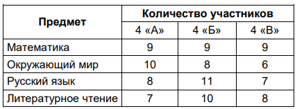 В школе подвели итоги участия 4-х классов в школьных олимпиадах. Количество участников в олимпиадах по предметам показано в таблице.