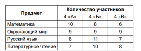 В школе подвели итоги участия 4-х классов в школьных олимпиадах. Количество участников в олимпиадах по предметам показано в таблице.