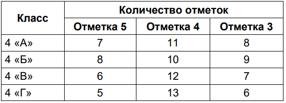 В школе подвели итоги годовой контрольной работы в 4-х классах. Все учащиеся выполняли работу и получили отметку 5, 4 или 3 (двоек не было). Количество полученных отметок за работу показано в таблице.