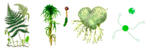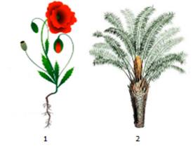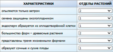 Задание 12. Установите соответствие между характеристиками и отделами растений, обозначенных цифрами 1 и 2 на рисунках. Для каждой позиции из первого столбца подберите соответствующую позицию из выпадающего списка.