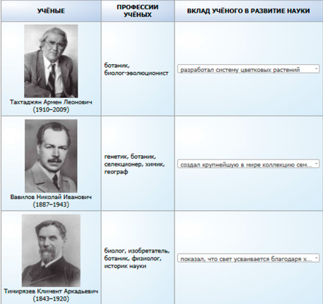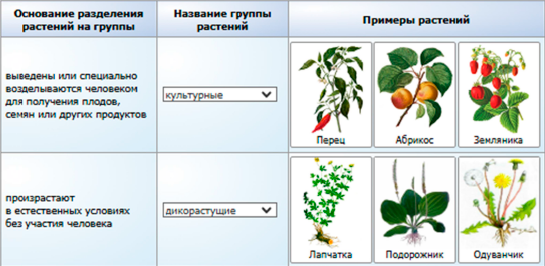 Заполните пустые ячейки таблицы: выберите нужные элементы из выпадающих списков и переместите по три рисунка растений в соответствующие ячейки.