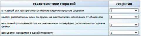 Установите соответствие между характеристиками и соцветиями, обозначенными на рисунке выше цифрами 1, 2, 3, 4. Для каждой позиции из первого столбца подберите соответствующую позицию из выпадающего списка.