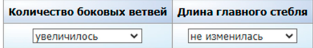 Как через месяц изменилось количество боковых ветвей растения и длина его главного стебля по сравнению с исходными размерами? Заполните пустые ячейки таблицы, выбрав нужные элементы из выпадающих списков.