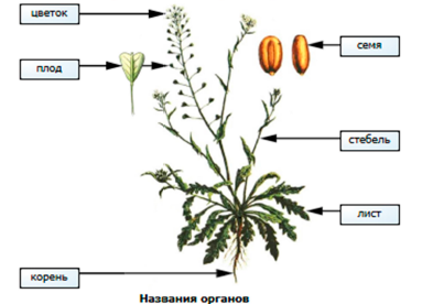 Задание 7. Установите соответствие между органами растения пастушья сумка, изображенного на рисунке, и их названиями, перетаскивая названия органов к соответствующим стрелкам.