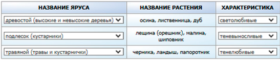 Задание 8. Изучите предлагаемый перечень растений в таблице «Лесные ярусы». Заполните пустые ячейки таблицы, выбрав нужные элементы из выпадающих списков.