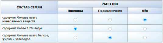 Используя содержание таблицы «Состав семян растений», выберите одно растение для каждой характеристики.