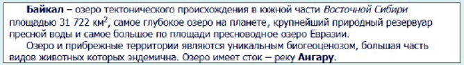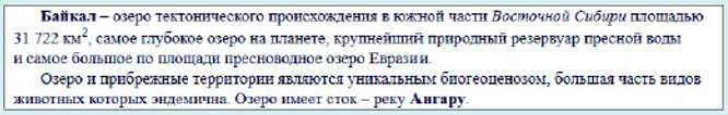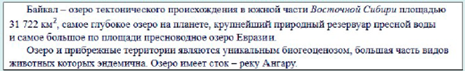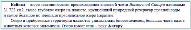 1. Байкал — озеро тектонического происхождения в южной части Восточной Сибири площадью 31 722 квадратных километра, самое глубокое озеро на планете, крупнейший природный резервуар пресной воды и самое большое по площади пресноводное озеро Евразии. Озеро и прибрежные территории являются уникальным биогеоценозом, большая часть видов животных которых эндемична. Озеро имеет сток — реку Ангару.
