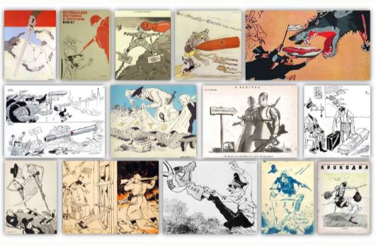 Задание 7. Рассмотрите предложенные ниже советские карикатуры художников, поднимавших своим творчеством боевой дух советских граждан в годы войны. Выберите те, которые отражают события, произошедшие в представленный на карте в задании 5 исторический период.