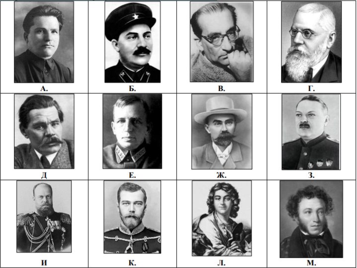 Задание 2. Многие учреждения образования, культуры, транспорта в нашей стране носили и продолжают носить имена знаменитых исторических деятелей, при этом некоторые из этих учреждений переименовывались. Перед Вами портреты некоторых исторических деятелей , имена которых носили либо продолжают носить эти учреждения, и таблица в Бланке ответов с указанием промежутка времени, когда эти учреждения носили имя в честь указанных деятелей. Ознакомьтесь с представленными материалами и заполните пропуски в таблице в Бланке ответов.