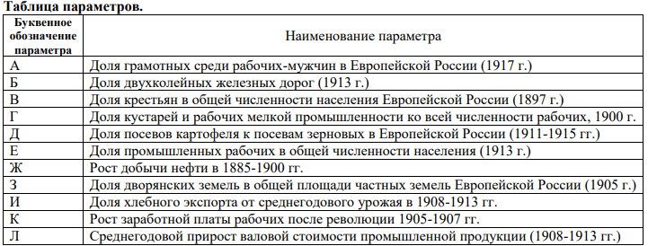 Задание 4. Перед Вами перечень 11 параметров социально-экономического развития России в конце XIX – начале ХХ в. Значения этих параметров находятся внутри процентных интервалов, которые показаны незаштрихованными на гистограмме в Бланке ответов. Соотнесите предложенные параметры с незаштрихованными процентными интервалами. Имейте в виду, что незаштрихованному интервалу каждого из пяти столбцов соответствуют два параметра, а один параметр в таблице является лишним. Впишите буквенные обозначения параметров (два) в гистограмму, в поле незаштрихованного интервала выбранного Вами столбца. Ниже укажите буквенное обозначение лишнего параметра.