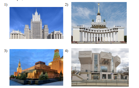 Задание 8. На каких двух из представленных ниже иллюстраций изображены памятники архитектуры 1920-х гг., относящиеся к стилю конструктивизм? Запишите цифры, под которыми представлены соответствующие иллюстрации.