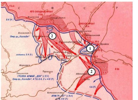 3) На карте-схеме обозначены действия Красной армии в ходе проведения операции «Уран».
