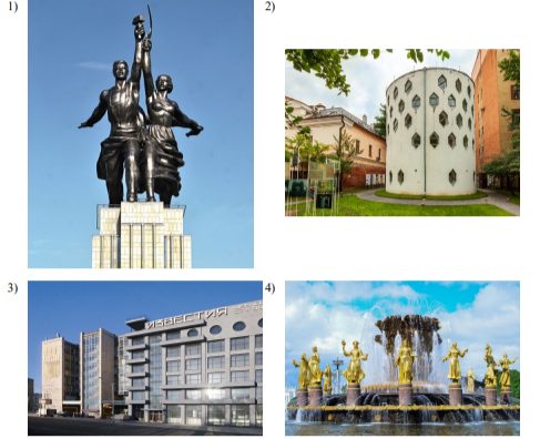 Задание 8. На каких двух из представленных ниже иллюстраций изображены памятники архитектуры 1920-х гг., относящиеся к стилю конструктивизм? Запишите цифры, под которыми представлены соответствующие иллюстрации.