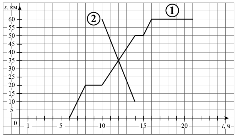 На рисунке график движения первого велосипедиста обозначен цифрой 1. Часть графика движения второго велосипедиста обозначена цифрой 2.