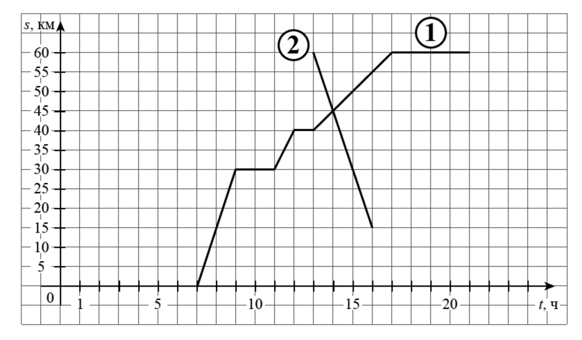 На рисунке график движения первого велосипедиста обозначен цифрой 1. Часть графика движения второго велосипедиста обозначен цифрой 2.