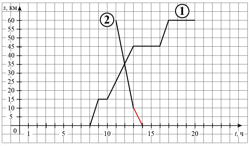На рисунке график движения первого велосипедиста обозначен цифрой 1. Часть графика движения второго велосипедиста обозначена цифрой 2.