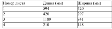 Задание 1. В таблице даны размеры (с точностью до мм) четырёх листов, имеющих форматы А1, АЗ, А5 и — А6. Установите соответствие между форматами и номерами листов. Заполните таблицу, в бланк ответов перенесите последовательность четырёх цифр, соответствующих номерам листов, без пробелов, запятых и дополнительных символов.