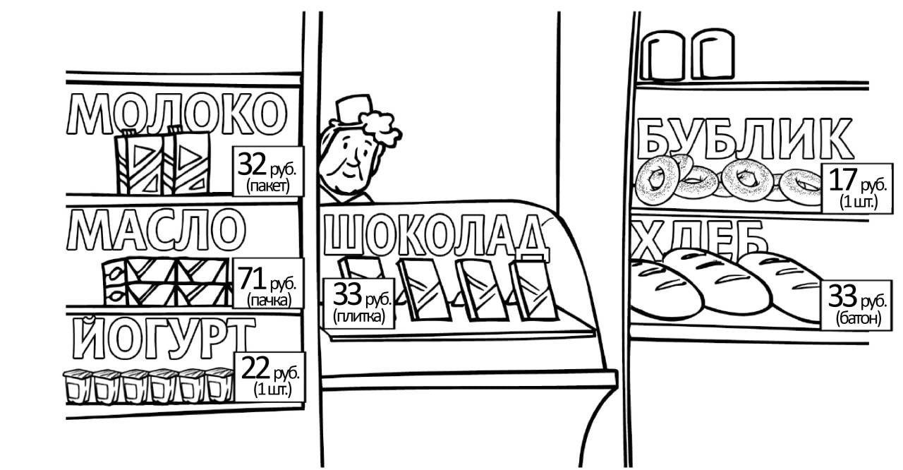 Задание 3. Рассмотри рисунок и ответь на вопрос: сколько рублей сдачи получит покупатель, расплатившийся за пакет молока и батон хлеба купюрой в 100 рублей?