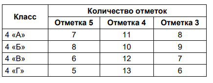 В школе подвели итоги годовой контрольной работы в 4-х классах. Все учащиеся выполняли работу и получили отметку 5, 4 или 3 (двоек не было). Количество полученных отметок за работу показано в таблице.